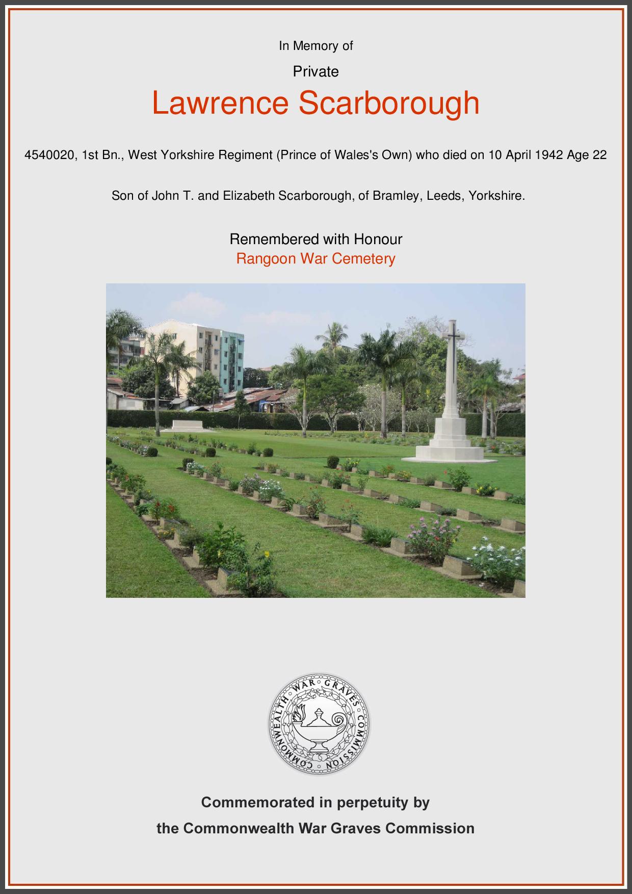DetailsLawrence Scarborough, 22 was a Private in the West Yorkshire Regiment (Prince of Wales Own) and died in Myanmar (formerly Burma) as a prisoner of war on 10th April 1942.…